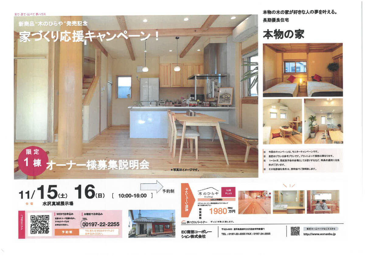 今月は新作発表会とうたい、家造りを考えているお客さまに素敵なお知らせです!限定1名様に特別価格にて弊社の平屋のオーナー様を募集いたします。