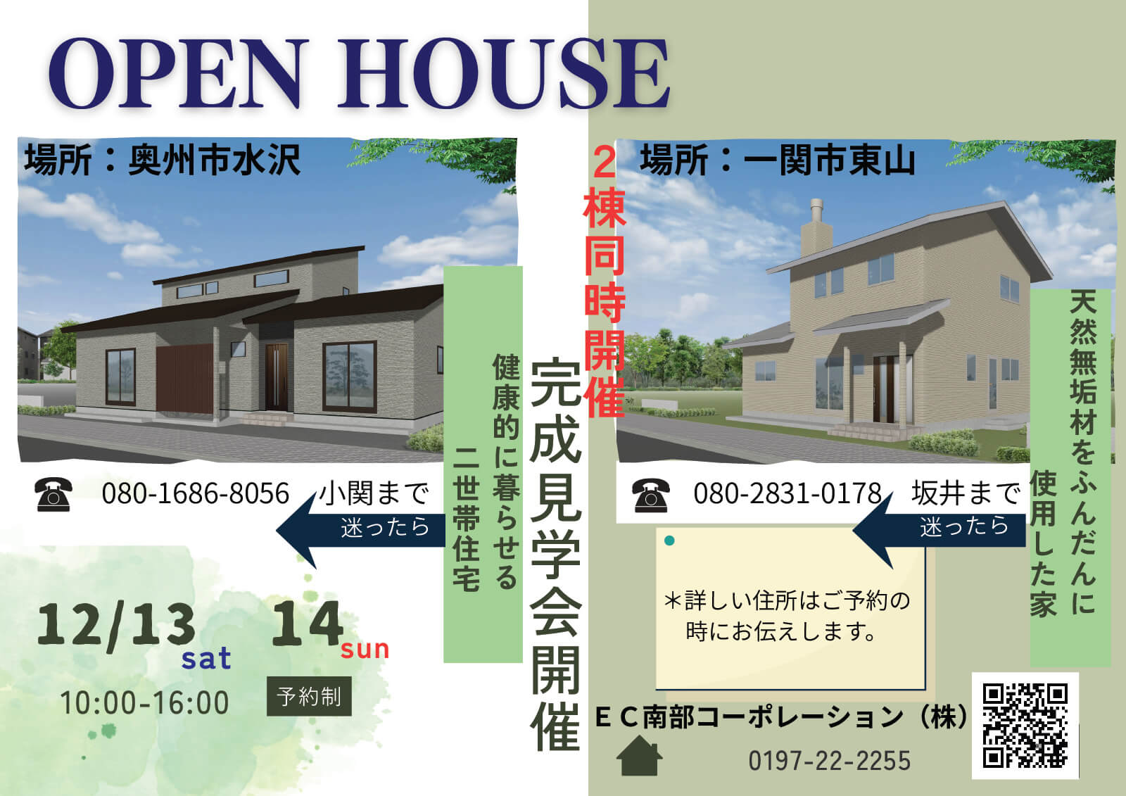 12月13日(土)、14日(日)に新築の完成見学会を同時開催いたします。